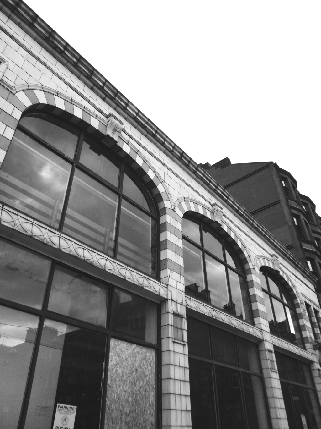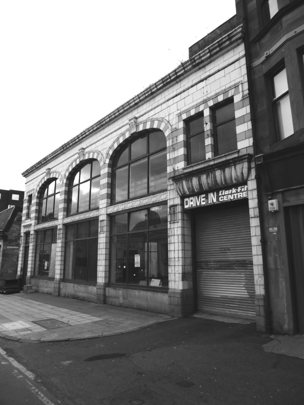 The building fronts on to Vinicombe Street with a squat two-storey, 5-bay facade of green and white faience. The large expanse of glazing of the three central bays allows light to penetrate deep into the plan and would have shown off the vehicles stored and being worked on inside. It’s easy to imagine Glaswegian’s with their noses pressed against the glass looking to admire these new and, at the time, rare machines. Wyllie prepared elevations that show the building extending to a third storey, but this was never constructed.
