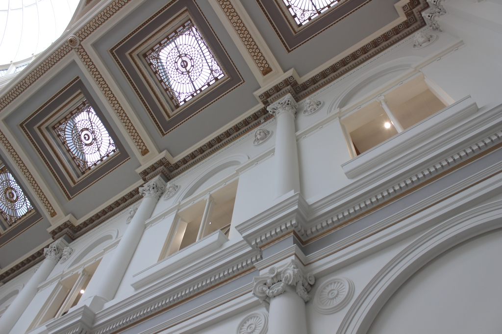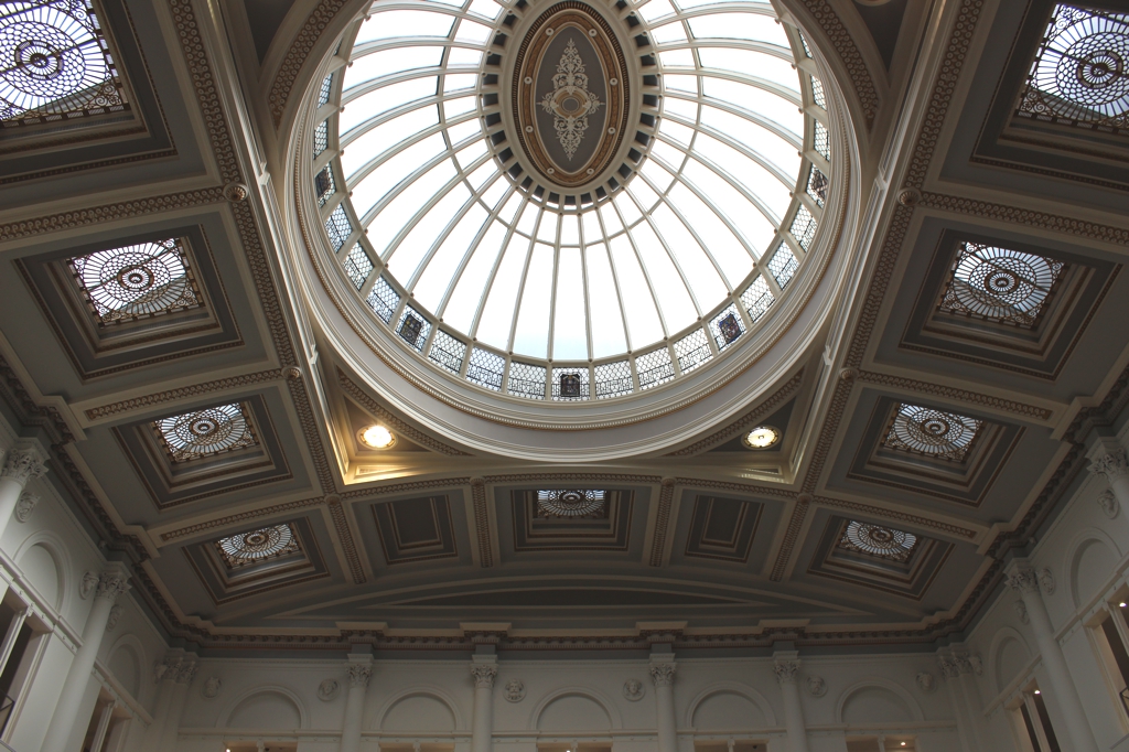 The arched ceiling that enclosed the space is really rather spectacular, each of the coffers contains a decorative leaded glass panel whilst centrally a huge elliptical cupola floods the space with light.