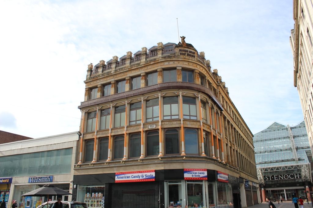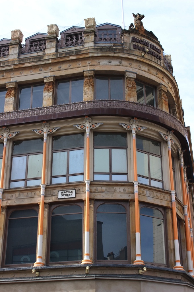 So now that the promo is taken care of we can dive right in to todays building! 63 Argyle Street as designed by the brilliant and aforementioned Alexander ‘Greek’ Thomson. First conceived in 1863 and completed in 1868 this shop and warehouse building is more commonly known as the Buck’s Head Building, the two reasons for this being that the site was formerly home to the Buck’s Head Hotel, and also that the current building has a big statue of a deer on the top of it!